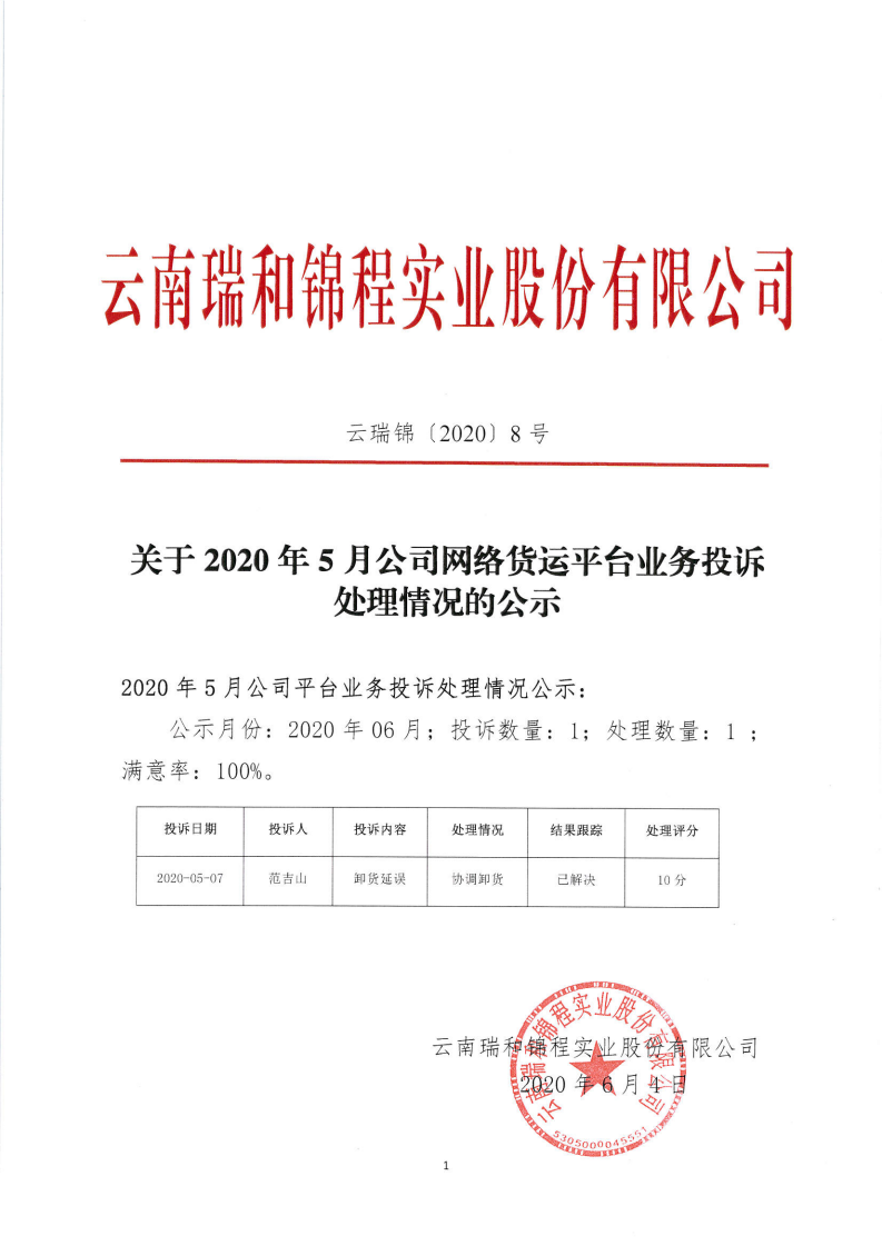 關于2020年5月公司網絡貨運平臺業(yè)務投訴處理情況的公示