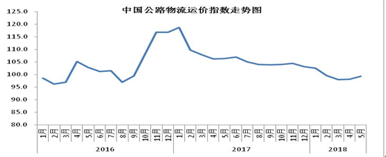 中國物流與采購聯(lián)合會發(fā)布的2018年5月份中國物流業(yè)景氣指數(shù)為56.1%,較上月回升1.5個(gè)百分點(diǎn);中國公路物流運(yùn)價(jià)指數(shù)為99.3點(diǎn),比上月回升1.13%。