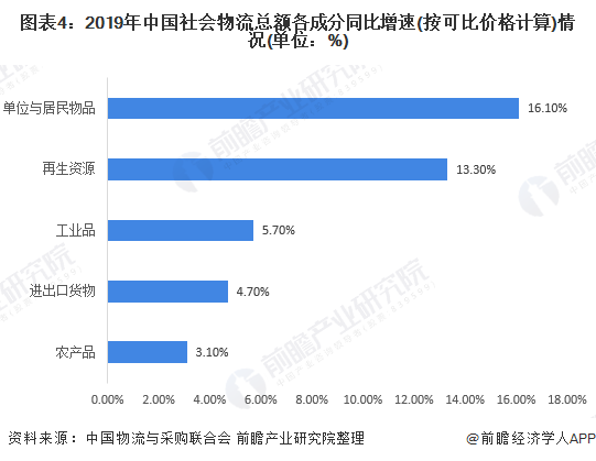 但從增速方面來看,2019年實現(xiàn)物流總額最快增長的產(chǎn)品類別為單位與居民物品,同比增速16.1%,較工業(yè)品物流總額同比增速高出10.7個百分點。與工業(yè)品物流總額增速逐漸放緩不同,我國單位與居民物品物流總額2010年以來一直保持較為快速的增長,對全國社會物流總額貢獻率呈現(xiàn)增長態(tài)勢,反映我國物流業(yè)轉(zhuǎn)型升級趨勢持續(xù)發(fā)展,產(chǎn)業(yè)結(jié)構(gòu)不斷優(yōu)化。
