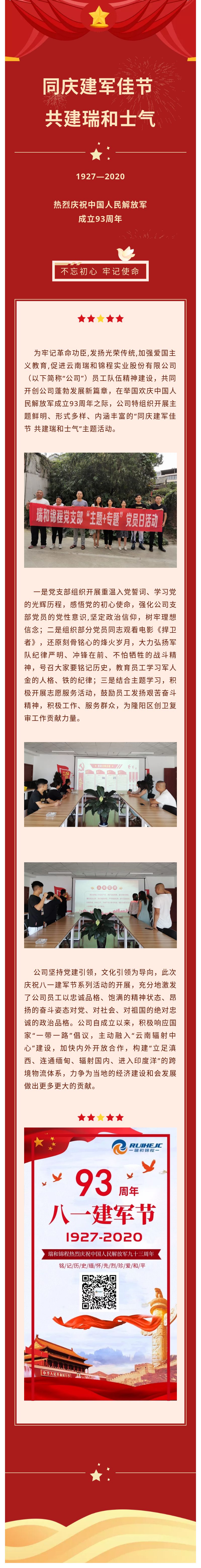 新聞動態(tài) 業(yè)務(wù)推介 黨建工會 電子刊物 公示公告 首頁 > 企業(yè)資訊 > 黨建工會 同慶建軍佳節(jié) 共建瑞和士氣 來源:瑞和錦程 瀏覽量:8132 日期:2020-08-01 上一篇:瑞和錦程第二屆工會委員會 換屆選舉工作圓滿完成 下一篇:緬懷英烈 致敬英雄