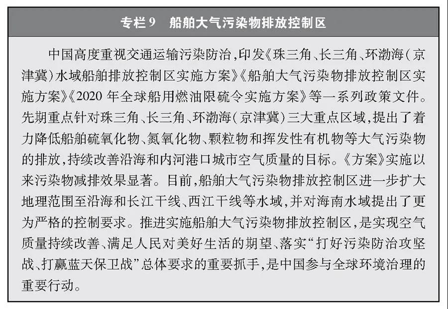 強化大氣與水污染防治。堅決打好交通運輸領(lǐng)域污染防治攻堅戰(zhàn),用最嚴(yán)格的制度、最嚴(yán)密的法治治理環(huán)境污染。在沿海和長江干線等水域設(shè)立船舶大氣污染物排放控制區(qū),按照國際公約要求對進(jìn)入中國水域的國際航行船舶實施船用燃油硫含量限制措施,推動船舶使用清潔能源和加裝尾氣污染治理裝備,建立船用低硫燃油供應(yīng)保障和聯(lián)合監(jiān)管機制。執(zhí)行船舶水污染物排放控制國家強制性標(biāo)準(zhǔn),推動港口船舶含油污水、化學(xué)品洗艙水、生活污水和垃圾等接收處置設(shè)施建設(shè),開展港口粉塵污染控制。在全國沿海實施“碧海行動”(注6)計劃,打撈存在污染環(huán)境風(fēng)險和影響海上交通運輸安全的沉船沉物。加快老舊和高能耗、高排放營運車輛、施工機械治理和淘汰更新,推進(jìn)實施機動車排放檢測與強制維護(hù)制度(I/M制度)。中央財政采取“以獎代補”方式支持京津冀及周邊地區(qū)、汾渭平原淘汰國Ⅲ及以下排放標(biāo)準(zhǔn)營運柴油貨車。全面開展運輸結(jié)構(gòu)調(diào)整三年行動,2012年至2019年全國機動車污染物排放量下降65.2%。