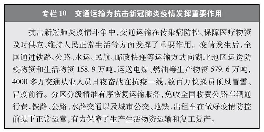 應(yīng)對突發(fā)公共事件處置能力顯著提升??茖W(xué)高效應(yīng)對各類突發(fā)公共事件,健全工作體系,提升應(yīng)急能力。新冠肺炎疫情發(fā)生后,中國果斷做出“一斷三不斷”(注7)部署,適時推出鐵路“七快速”(注8),公路“三不一優(yōu)先”(注9),水運“四優(yōu)先”(注10),民航客運“五個一”(注11)、貨運“運貿(mào)對接”(注12)以及郵政“綠色通道”等政策措施,一方面全力阻斷病毒通過交通工具傳播,另一方面保障全國各地應(yīng)急物資運輸和人民生活需求,為打贏疫情防控人民戰(zhàn)爭、總體戰(zhàn)、阻擊戰(zhàn)提供了有力支撐。