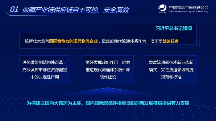 習(xí)近平總書記指出:流通體系在國(guó)民經(jīng)濟(jì)中發(fā)揮著基礎(chǔ)性作用,構(gòu)建新發(fā)展格局,必須把建設(shè)現(xiàn)代流通體系作為一項(xiàng)重要戰(zhàn)略任務(wù)來(lái)抓。要貫徹新發(fā)展理念,推動(dòng)高質(zhì)量發(fā)展,深化供給側(cè)結(jié)構(gòu)性改革,充分發(fā)揮市場(chǎng)在資源配置中的決定性作用,更好發(fā)揮政府作用,統(tǒng)籌推進(jìn)現(xiàn)代流通體系硬件和軟件建設(shè),發(fā)展流通新技術(shù)新業(yè)態(tài)新模式,完善流通領(lǐng)域制度規(guī)范和標(biāo)準(zhǔn),培育壯大具有國(guó)際競(jìng)爭(zhēng)力的現(xiàn)代物流企業(yè),為構(gòu)建以國(guó)內(nèi)大循環(huán)為主體、國(guó)內(nèi)國(guó)際雙循環(huán)相互促進(jìn)的新發(fā)展格局提供有力支撐,保障產(chǎn)業(yè)鏈供應(yīng)鏈自主可控、安全高效。
