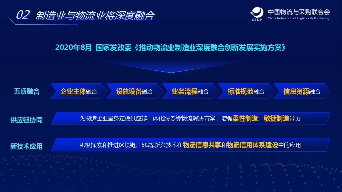 2020年8月,國(guó)家發(fā)改委印發(fā)了《推動(dòng)物流業(yè)制造業(yè)深度融合創(chuàng)新發(fā)展實(shí)施方案》,文件指出,要促進(jìn)企業(yè)主體、設(shè)施設(shè)備、業(yè)務(wù)流程、標(biāo)準(zhǔn)規(guī)范、信息資源五項(xiàng)融合,支持物流企業(yè)與制造企業(yè)通過(guò)市場(chǎng)化方式創(chuàng)新供應(yīng)鏈協(xié)同共建模式;實(shí)現(xiàn)樞紐園區(qū)、鐵路專用線、倉(cāng)庫(kù)等物流基礎(chǔ)設(shè)施的有機(jī)聯(lián)動(dòng);引導(dǎo)物流、快遞企業(yè)為制造企業(yè)量身定做供應(yīng)鏈一體化服務(wù)等物流解決方案,增強(qiáng)柔性制造、敏捷制造能力;同時(shí)加強(qiáng)各項(xiàng)標(biāo)準(zhǔn)的協(xié)調(diào)銜接,積極探索和推進(jìn)區(qū)塊鏈、5G等新興技術(shù)在物流信息共享和物流信用體系建設(shè)中的應(yīng)用,實(shí)現(xiàn)采購(gòu)、生產(chǎn)、流通等上下游環(huán)節(jié)信息實(shí)時(shí)采集、互聯(lián)共享,推動(dòng)提高生產(chǎn)制造和物流一體化運(yùn)作水平。